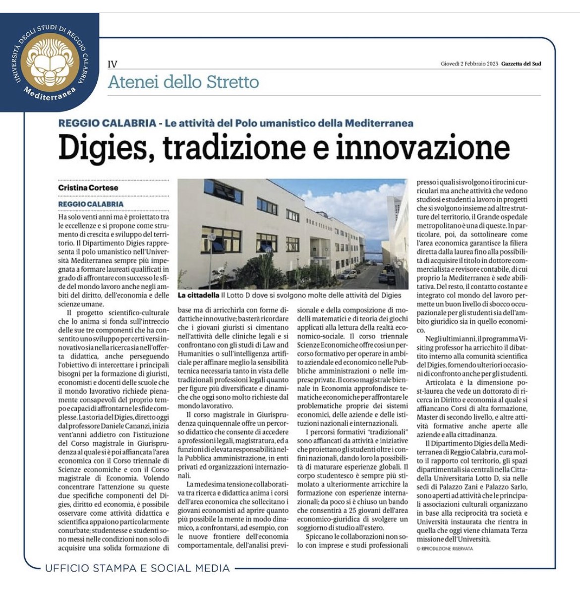 Il Dipartimento DiGiES UniRC rappresenta il polo umanistico nell’Università Mediterranea sempre più impegnata a formare laureati qualificati in grado di affrontare con successo le sfide del mondo lavoro anche negli ambiti del diritto, dell’economia e delle scienze umane.