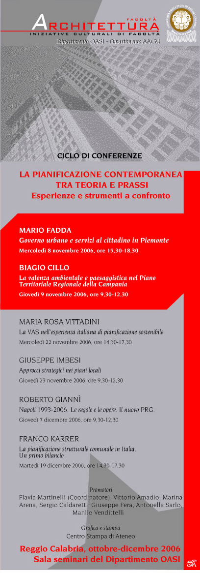 L'8 novembre prende il via il ciclo di conferenze La pianificazione contemporanea tra teoria e prassi - esperienze e strumenti a confronto. La prima conferenza: Governo urbano e servizi al cittadino, relatore Mario Fadda, avrà inizio ore 15.30 presso la Sala seminari del dipartimento OASI.