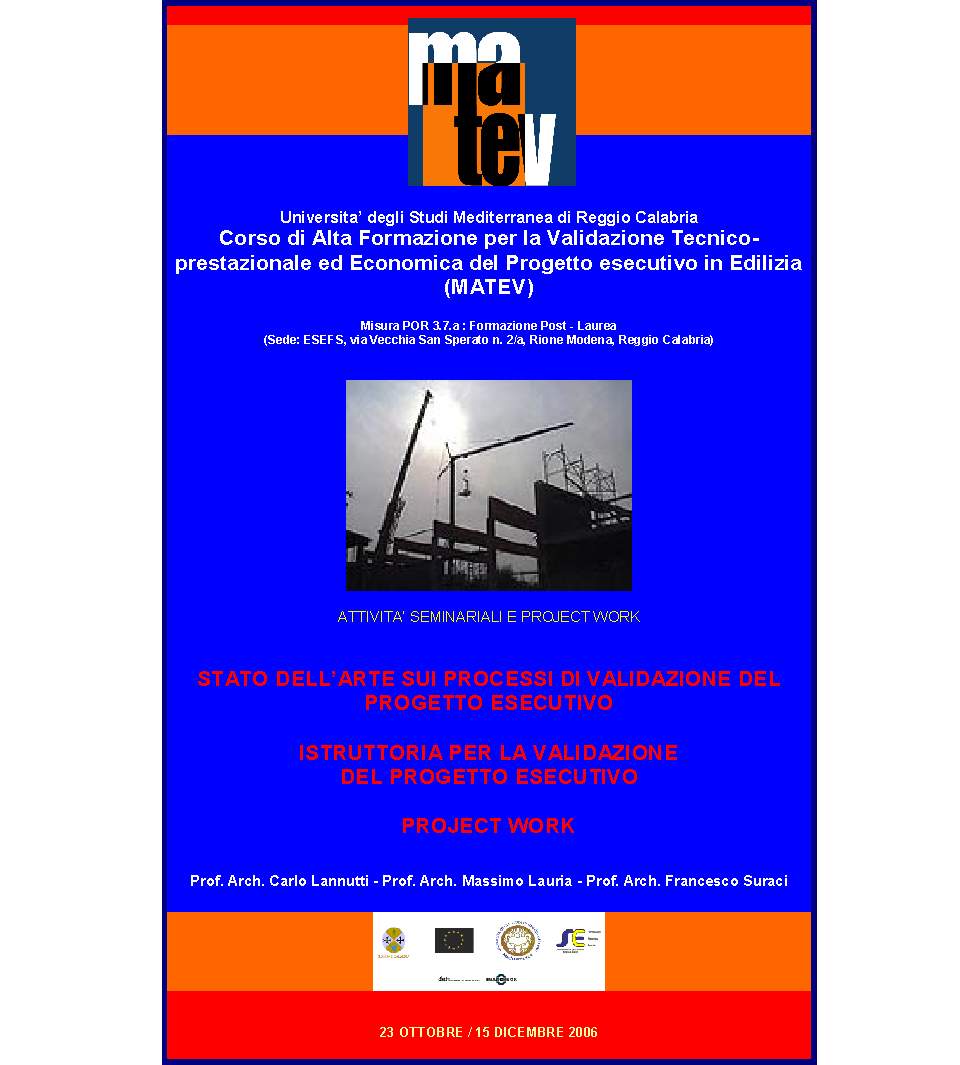 Le attivita’ sono svolte dai proff. Carlo Lannutti, Massimo Lauria, e Francesco Suraci e si articolano in tre fasi: a) Stato dell’arte sui processi di validazione del progetto esecutivo; b) Istruttoria per la validazione del progetto esecutivo; c) Project work.