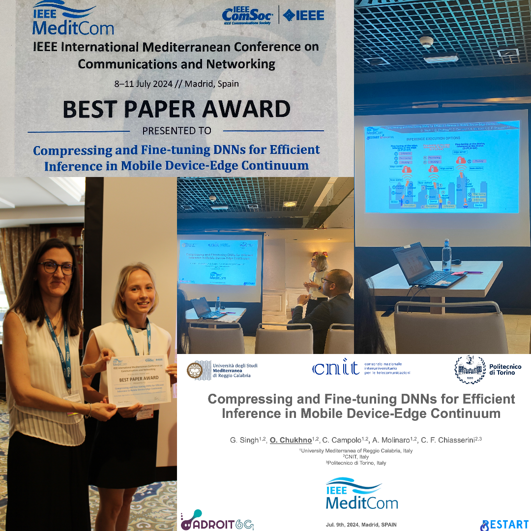 Il lavoro scientifico dal titolo "Compressing and Fine-tuning DNNs for Efficient Inference in Mobile Device-Edge Continuum", di cui sono autori l'Ing. Gurtaj Singh (studente del corso di dottorato in Ingegneria dell'Informazione del DIIES), la ricercatrice Olga Chukhno, la Prof.ssa Claudia Campolo e la Prof.ssa Antonella Molinaro, realizzato in collaborazione con la Prof.ssa Carla Fabiana Chiasserini del Politecnico di Torino, ha ricevuto il Best Paper Award nell'ambito del convegno internazionale IEEE Mediterranean Conference on Communications and Networking (MEDITCOM) 2024.