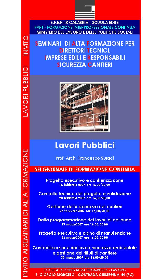 L’EFEPIR Calabria - Scuola edile, FART Formazione interprofessionale continua e Ministero del lavoro e delle politiche sociali hanno organizzato sei seminari di alta formazione sulla Gestione del cantiere e sulla cantierizzazione del progetto esecutivo nei lavori pubblici dedicati a direttori tecnici di cantiere, imprese edili e responsabili sicurezza cantieri da tenersi nel periodo febbraio-marzo 2007 a San Giorgio Morgeto (RC). Le relazioni saranno tenute dal prof. arch. Francesco Suraci.