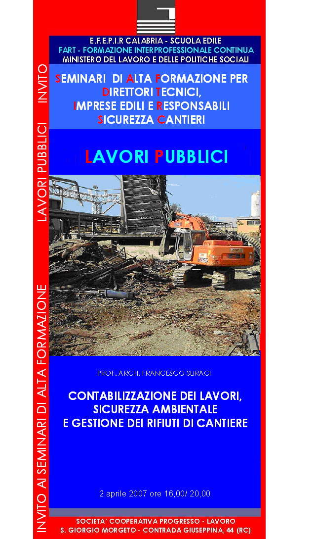 Il 2 aprile alle ore 16,00 presso la società cooperativa Progresso-Lavoro a S. Giorgio Morgeto si terrà il seminario di alta formazione: Contabilizzazione dei lavori, sicurezza ambientale e gestione dei rifiuti di cantiere. Il seminario vuole contribuire all’aggiornamento di figure professionali. Sara’ esaminata la legislazione in materia ambientale, compreso il nuovo codice dell'ambiente, prendendo in esame le problematiche dei cantieri sulla condotta e la contabilita’ dei lavori in materia di stoccaggio e smaltimento del rifiuti di demolizione e di lavorazione.