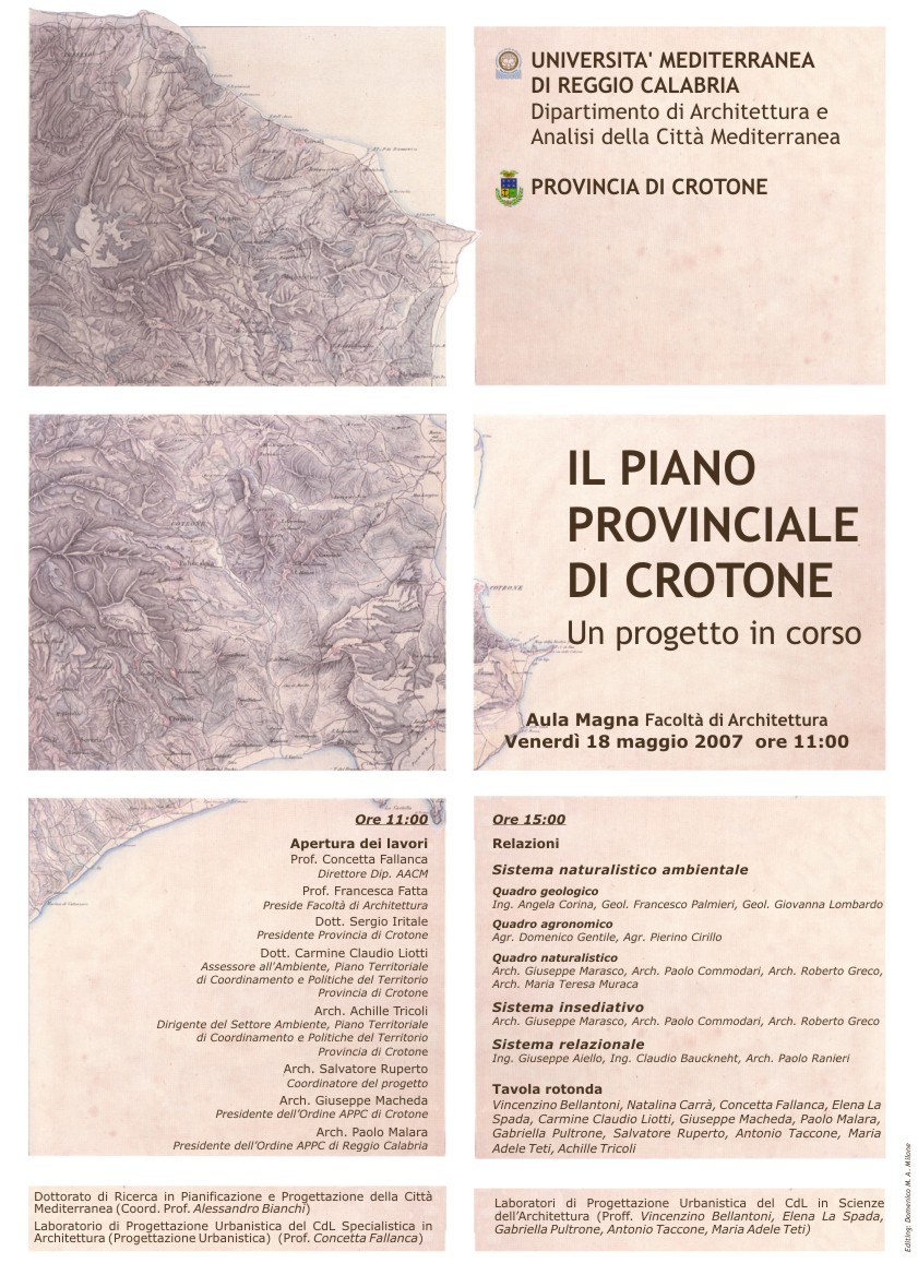 Il 18 maggio 2007 presso l'Aula Magna della Facoltà di Architettura si terrà l'incontro "Il piano provinciale di Crotone. Un progetto in corso". Il seminario è organizzato dal Dipartimento di Architettura e Analisi della Città Mediterranea con la Provincia di Crotone, il dottorato di ricerca in Pianificazione e progettazione della città mediterranea ed i corsi di Laboratorio di Progettazione Urbanistica del CdL Specialistica in Architettura (Progettazione Urbanistica) e del CdL in Scienze dell'Architettura. In allegato la locandina con il programma.
