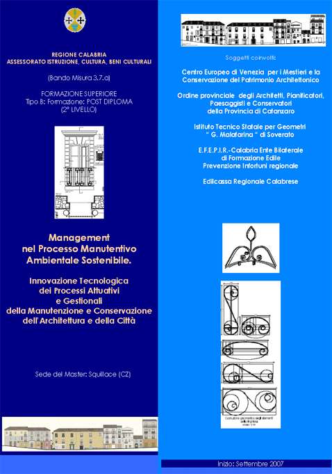 Titolo completo del corso di formazione superiore: Management nel processo manutentivo ambientale sostenibile. Innovazione tecnologica dei processi attuativi e gestionali della manutenzione e conservazione dell’architettura e della città. Inizio attivita’ settembre 2007 Sede del corso:Squillace (CZ) Il Corso è finanziato dalla Regione Calabria - Assessorato Istruzione, Cultura, Beni Culturali. Gli altri soggetti coinvolti: Centro europeo di Venezia per i mestieri e la conservazione del patrimonio architettonico. Ordine degli Architetti pianificatori, paesaggisti e conservatori della Provincia di Catanzaro. Istituto Tecnico Statale per Geometri “G. Malafarina” di Soverato E.F.E.P.I.R.- Calabria Ente Bilaterale di Formazione Edile Prevenzione Infortuni regionale (Soggetto Attuatore) Edilcassa Regionale Calabrese. Progetto scientifico: prof. arch. Francesco Suraci Per maggiori informazioni vai al link