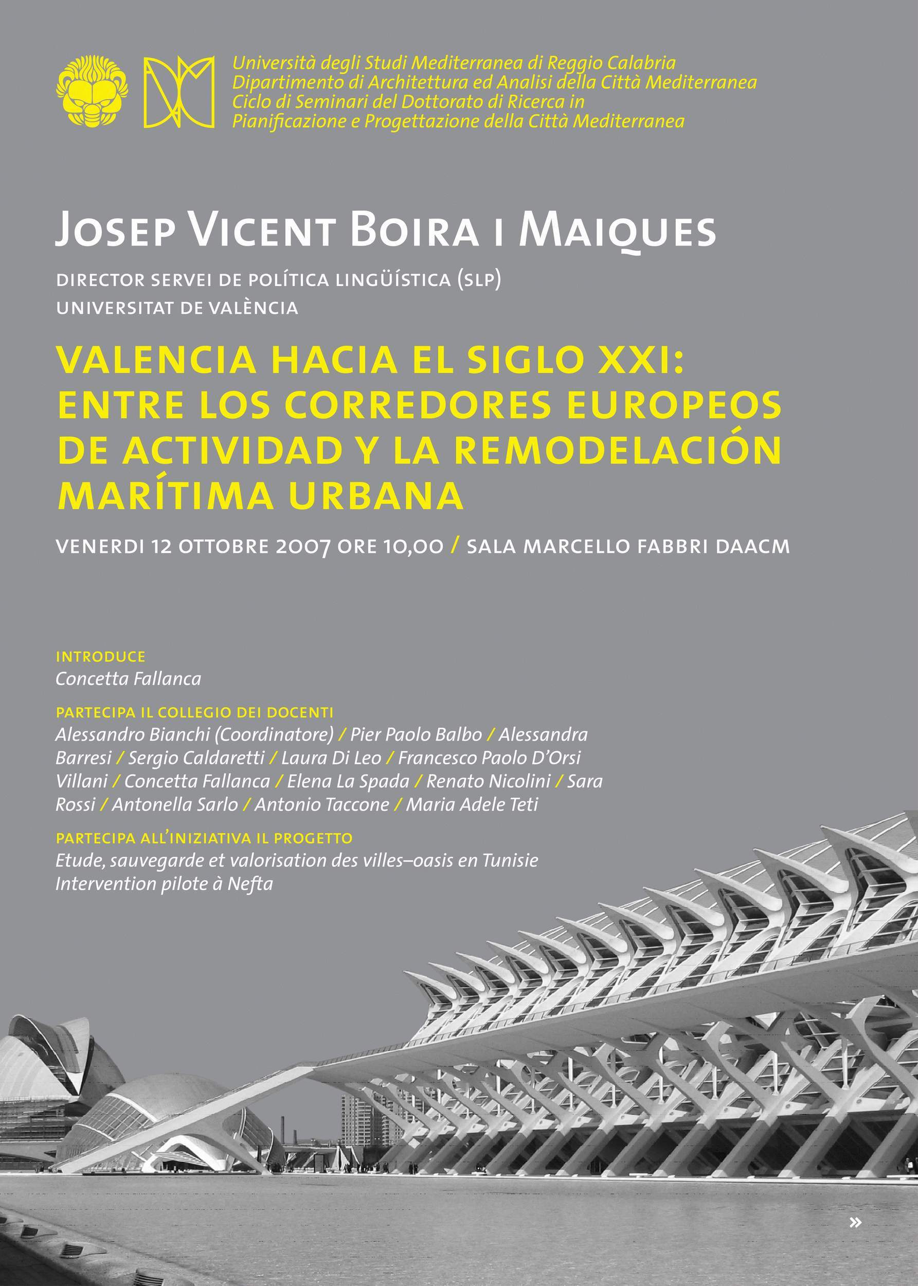 Il 12 ottobre ore 10.00 presso la saletta Marcello Fabbri del Dipartimento AACM, si terrà il seminario Valencia hacia el siglo XXI: entre los corredores europeos de actividad y la remodelacìon marìtima urbana tenuto dal prof. Iosep Vincent Boira I Maiques (Universitat de Valencia), nell'ambito del Ciclo di Seminari del Dottorato di ricerca in Pianificazione e progettazione della città mediterranea. Partecipa all'iniziativa il progetto: Etude, sauvegarde et valorisation des villes-oasis en Tunisie. Intervention pilote à Nefta.