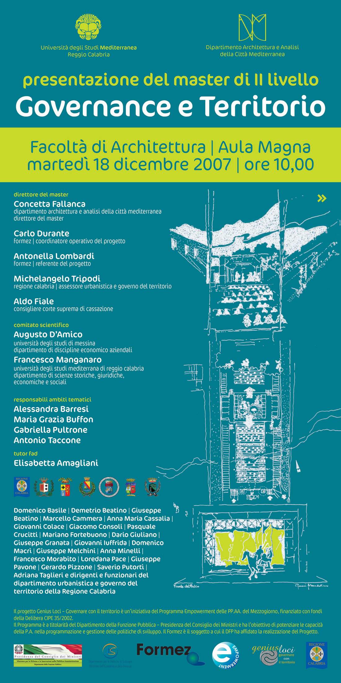 Il prossimo 18 dicembre si svolgerà, nell’Aula magna della Facoltà di Architettura la giornata inaugurale del Master “Governance e Territorio” con la presenza dei rappresentanti del Formez e di tutti gli Enti locali che hanno manifestato il loro interesse. Il master di II livello è proposto dal Dipartimento di Architettura e Analisi della Città Mediterranea in collaborazione con il Formez, ed è rivolto ai dirigenti e funzionari delle amministrazioni pubbliche del Mezzogiorno (26 dirigenti/funzionari delle PP.AA calabresi aderenti), con la possibilità di partecipazione di 14 giovani laureati. Il Master fa parte del progetto “Genius Loci - Governare con il territorio”, all’interno del Programma Empowerment delle PP. AA. del Mezzogiorno, ed è finanziato con i fondi della delibera CIPE n. 36 del 2002. È un progetto del Dipartimento della Funzione Pubblica – Presidenza del Consiglio dei Ministri, che ne ha affidato al Formez la realizzazione. Il Master ha l’obiettivo di potenziare le capacità della pubblica amministrazione nella programmazione e gestione delle politiche di sviluppo. Strutturato secondo un disegno generale in grado di offrire una interessante opportunità per i destinatari che sono chiamati a gestire gli innovativi processi di pianificazione e programmazione, in attuazione della Legge urbanistica regionale ed è svolto in partenariato con il Dipartimento di Scienze Storiche, Giuridiche, economiche e Sociali dell’Università degli Studi Mediterranea di Reggio Calabria e il Dipartimento di Discipline Economico Aziendali dell’Università degli Studi di Messina e vede la Regione Calabria-Dipartimento n° 8 Urbanistica e Governo del Territorio come Ente capofila delle Amministrazioni aderenti.