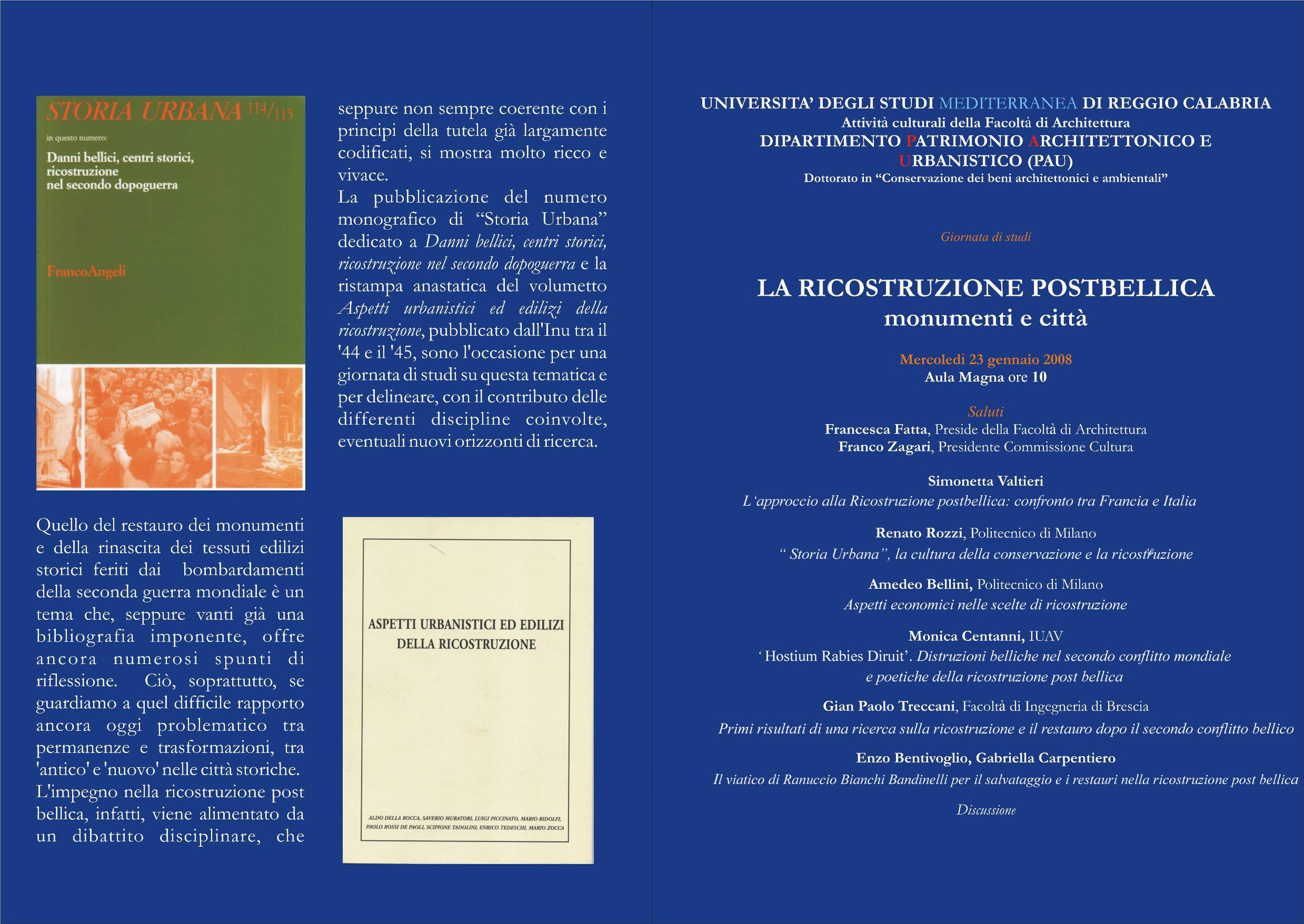 Il Dipartimento PAU organizza per mercoledì 23 gennaio alle ore 10.00 - Aula Magna della facoltà di Architettura - una giornata di studi su "La ricostruzione postbellica, monumenti e città" Locandina in allegato