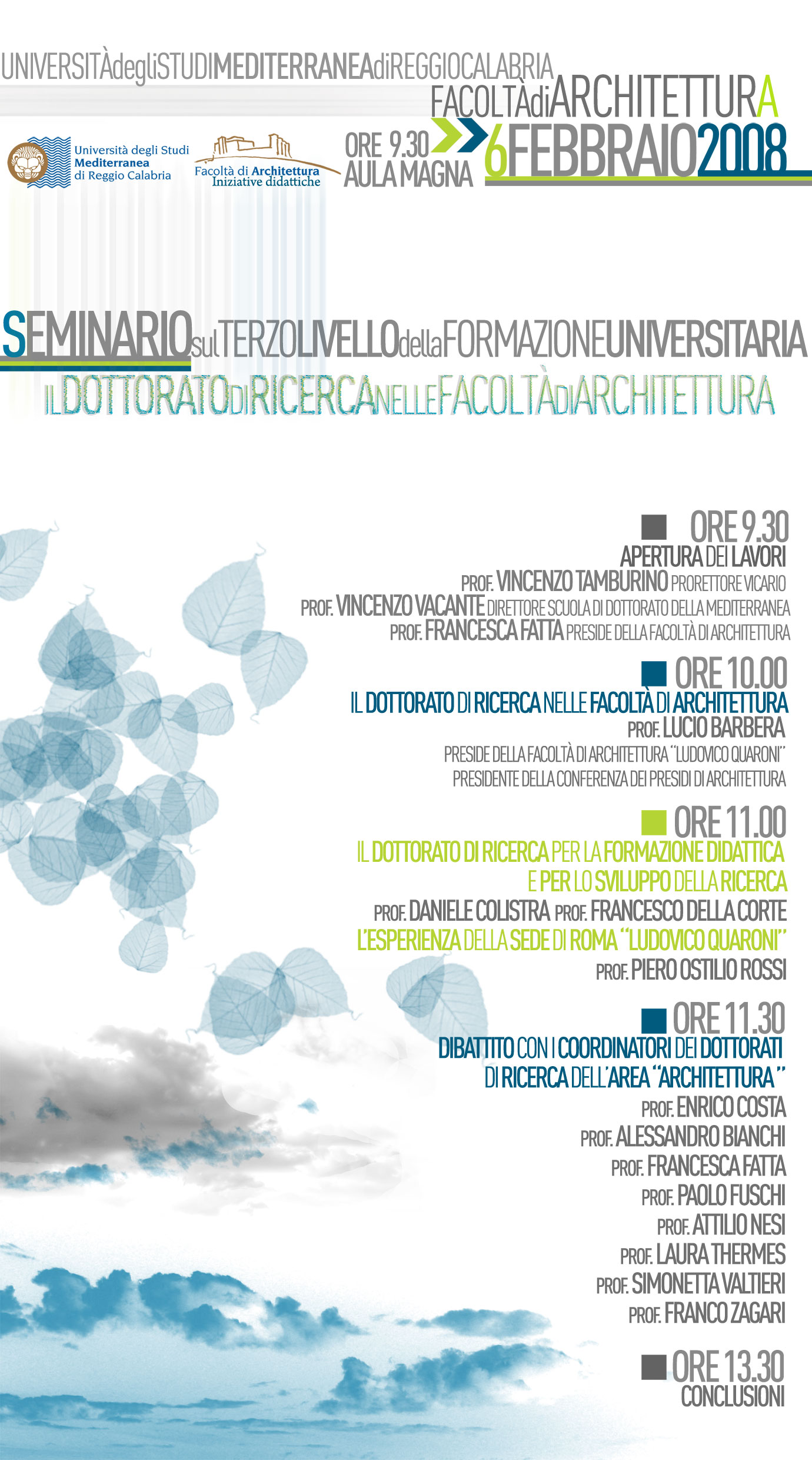 Mercoledì 6 gennaio alle ore 9.30 presso l'Aula Magna della Facoltà di Architettura si terrà un seminario dal titolo " Terzo Livello della Formazione Universitaria" Nel seminario si discuterà dei seguenti temi, il Dottorato di Ricerca nelle Facoltà di Architettura in Italia, il Dottorato di Ricerca per la formazione didattica e per lo sviluppo della ricerca, si parlerà anche dell'esperienza della sede di Roma "Ludovico Quaroni" in conclusione ci sarà un dibattito con i coordinatori dei Dottorati di Ricerca dell'Area di Architettura. In allegato il programma del seminario