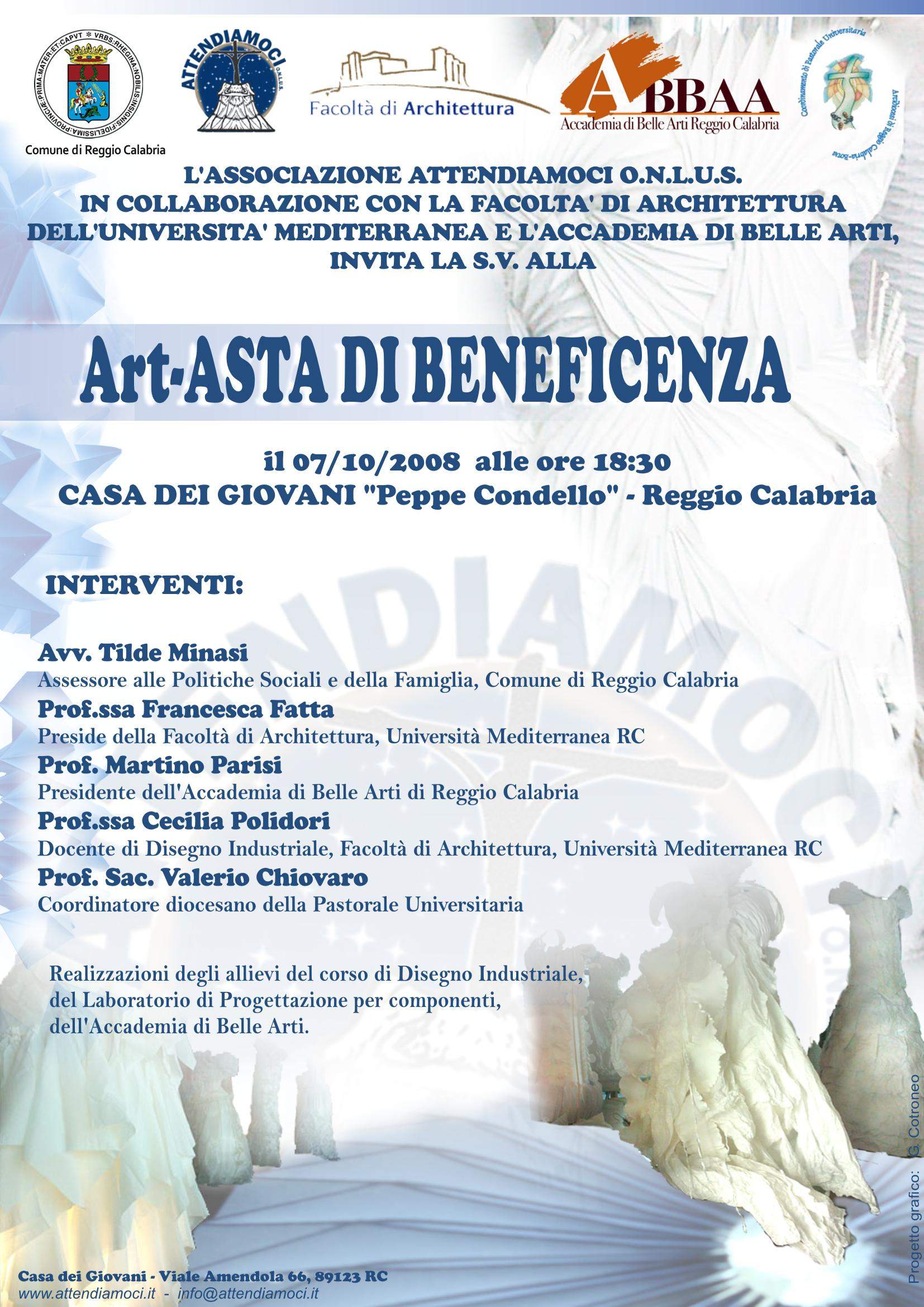 L’Associazione Attendiamoci Onlus, in collaborazione con la facoltà di Architettura dell’Università Mediterranea e l’Accademia di Belle Arti di Reggio Calabria, promuove per il prossimo 7 ottobre alle ore 18.30, presso la Casa dei Giovani “Peppe Condello” (viale Amendola, 66), l’Art-Asta di beneficenza, con le realizzazioni degli allievi del corso di Disegno Industriale, del Laboratorio di Progettazione per componenti e dell’Accademia di Belle Arti. Parteciperanno all’evento: l’Assessore alle Politiche Sociali e della Famiglia del Comune di Reggio Calabria Avv. Tilde Minasi, la Preside della facoltà di Architettura della Mediterranea Prof.ssa Francesca Fatta, il Presidente dell’Accademia di Belle Arti di Reggio Calabria Prof. Martino Parisi, la Docente di Disegno Industriale della facoltà di Architettura dell’Ateneo reggino Prof.ssa Cecilia Polidori, il Coordinatore diocesano della Pastorale Universitaria e Presidente dell’Associazione Attendiamoci Onlus Prof. Sac. Valerio Chiovaro. Per informazioni: www.attendiamoci.it (linkato). Locandina in allegato