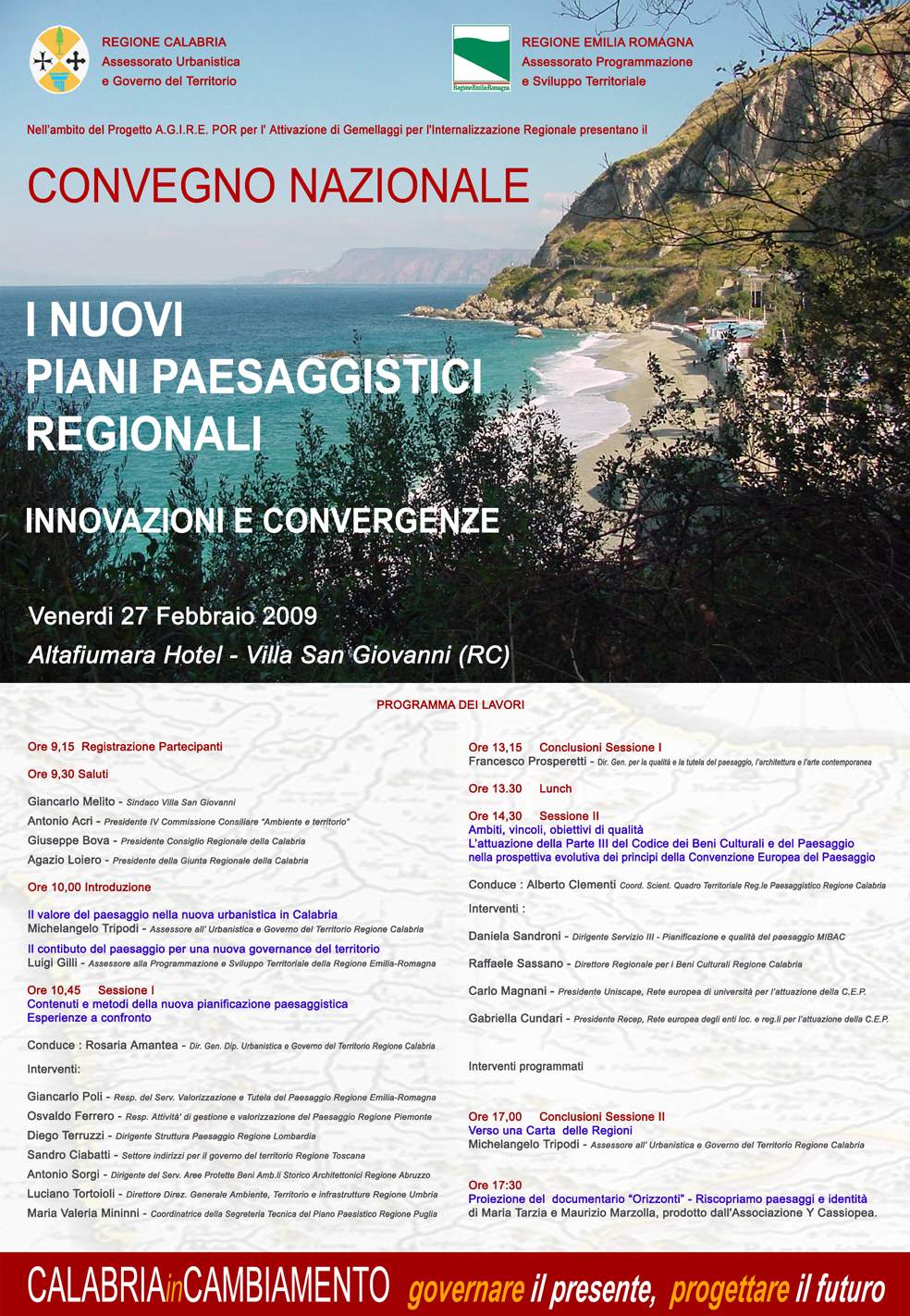 A distanza di due anni dal Forum delle Regioni e Province Europee dal titolo “PaeSaggi:Territorio, Identità, Progetto. Strumenti Percorsi e Strategie per il governo del territorio e la valorizzazione dei paesaggi” svoltosi il 19 gennaio 2007, l’Assessorato all’Urbanistica e Governo del Territorio guidato dall’Assessore on. Michelangelo Tripodi promuove un nuovo Convegno Nazionale dal titolo: “I nuovi Piani paesaggistici Regionali. Innovazioni e convergenze”, che si svolgerà Venerdi 27 Febbraio presso l’Hotel Altafiumara a Villa San Giovanni a partire dalle ore 9. Il Convegno, promosso da Regione Calabria e Regione Emilia Romagna nell’ambito del progetto di Gemellaggio A.G.I.R.E. POR e del Protocollo di Collaborazione “Buone pratiche nella tutela del paesaggio e del territorio per il funzionamento dell’Osservatorio Regionale per il Paesaggio”, muove dalla necessità di promuovere e diffondere una nuova cultura del paesaggio nell’ambito dell’elaborazione del Piano paesaggistico, attraverso un costruttivo dibattito che possa individuare possibili contenuti e metodi della pianificazione paesaggistica in atto presso le Regioni indagando Ambiti, vincoli, obiettivi di qualità per la definizione di indirizzi operativi di pianificazione del paesaggio verso l’attuazione dei principi della Convenzione Europea del Paesaggio e della Parte III del Codice dei Beni Culturali e del Paesaggio. Le componenti sulle quali la Calabria oggi si misura – e i temi sui quali ci si interroga in termini di progetto di paesaggio - riguardano il progetto di paesaggio come contenimento dell’uso incontrollato del suolo e delle risorse naturali. Questo infatti è anche l’assunto della Convenzione Europea del Paesaggio che riconosce la qualità e la diversità dei paesaggi quale elemento caratterizzante e fonte di ricchezza per i contesti europei, e afferma l’importanza di valorizzare le aspirazioni delle popolazioni di godere di un paesaggio di qualità, oltre che evidenziare che la tutela del paesaggio non è in contrasto con lo sviluppo economico, ma favorisce lo sviluppo sostenibile ed il coinvolgimento sociale. L’impegno per la implementazione della Convenzione Europea del paesaggio assunto formalmente a Strasburgo con la sottoscrizione dello Statuto della RECEP, significa ribadire l’importanza dell’investimento fatto sulle tematiche paesaggistiche che, anche nella individuazione degli obiettivi del prossimo Programma Operativo 2007-2013, costituiscono il filo conduttore di una strategia ispirata alla valorizzazione del patrimonio di identità, storia, natura che la Regione Calabria offre. Quello stesso patrimonio che, da troppo tempo saccheggiato da politiche di sviluppo aggressive caratterizzate dall’irrazionale consumo di territorio, può oggi costituire l’elemento di rinascita per una vera politica competitiva a livello internazionale. In sintesi ciò che è stato avviato rappresenta un modo nuovo di governare il territorio con un obiettivo primario che è quello dello sviluppo sostenibile del territorio a partire dalle sue specificità, che devono essere considerate come vere risorse per la costruzione di una Agenda di Interventi per lo sviluppo. Questo è l’approccio che ha portato anche a inserire il paesaggio come uno dei riferimenti principali nel nuovo Programma Operativo regionale per la gestione dei fondi strutturali 2007-2013. L’evento programmato per il prossimo 27 febbraio costituisce, dunque, un ulteriore tassello nella politica attuata dall’Assessorato Urbanistica, fin da principio incentrata sulle questioni che riguardano le problematiche connesse al “corretto uso del territorio”, oltre a rappresentare un importante momento di confronto di livello Nazionale confermando il ruolo propositivo che la Regione Calabria, anche in quanto capofila in seno alla Conferenza Stato-Regioni, ha assunto in materia di Paesaggio. Il Seminario, infatti, anche grazie alla presenza di referenti istituzionali come le Regioni italiane impegnate nella redazione degli strumenti per di governo e la tutela del Paesaggio e il Ministero per i beni e le attività culturali, costituirà un momento importante di concertazione istituzionale che confluirà nella proposta di una Carta nella quale saranno sanciti alcuni principi cardine e, soprattutto, condivisi per la corretta interpretazione delle norme nazionali e comunitarie in materia di Paesaggio. Locandina allegata