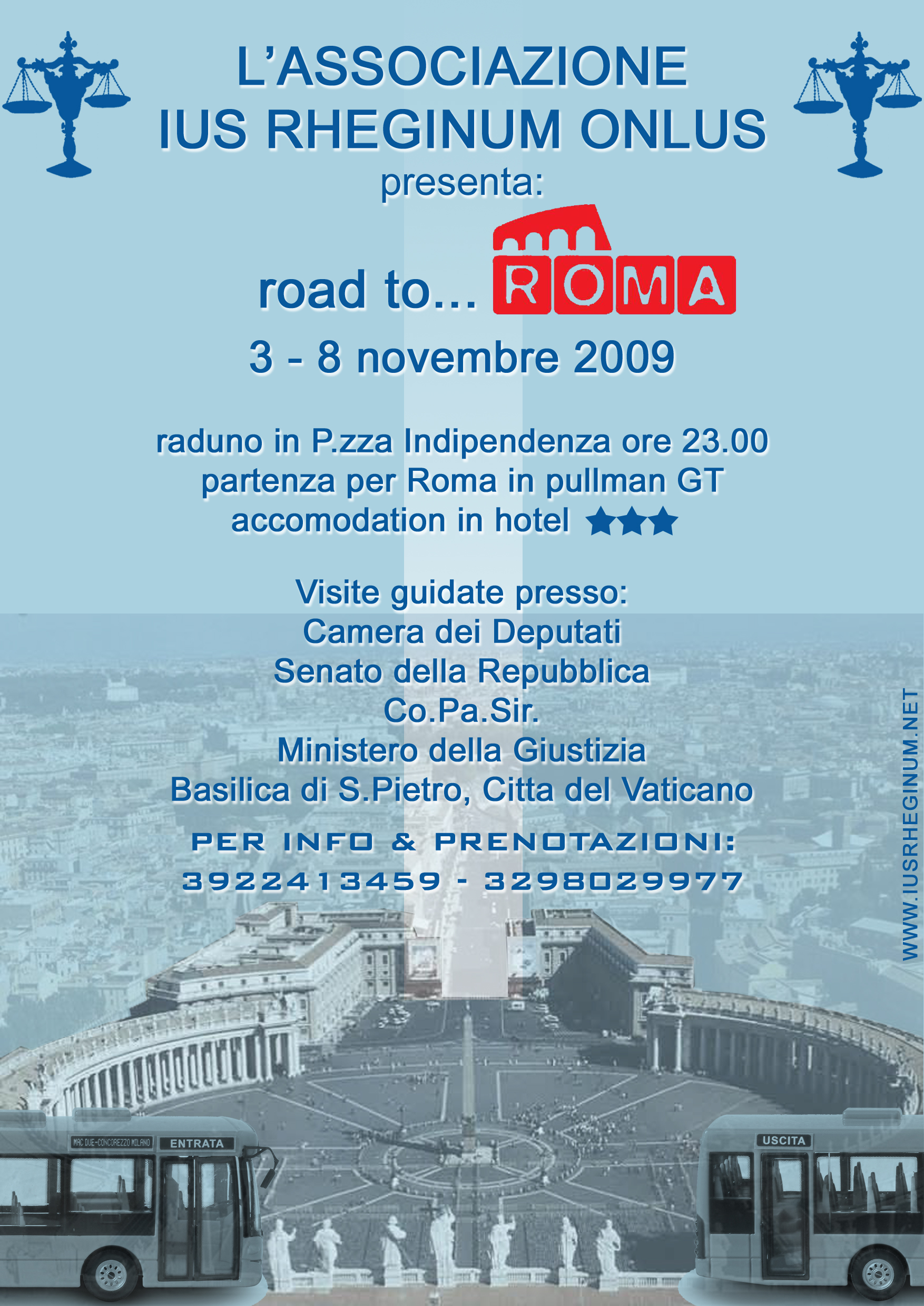 L’associazione studentesca Ius Rheginum organizza dal 3 all’8 novembre 2009 un viaggio studentesco-universitario a Roma presso le sedi delle principali istituzioni italiane, con interessanti visite ed incontri. Info Rappresentanti degli studenti Antonino Castorina cell. 320.8864888 Filippo Surace cell. 329.8029977 e mail: iusrheginum@hotmail.it