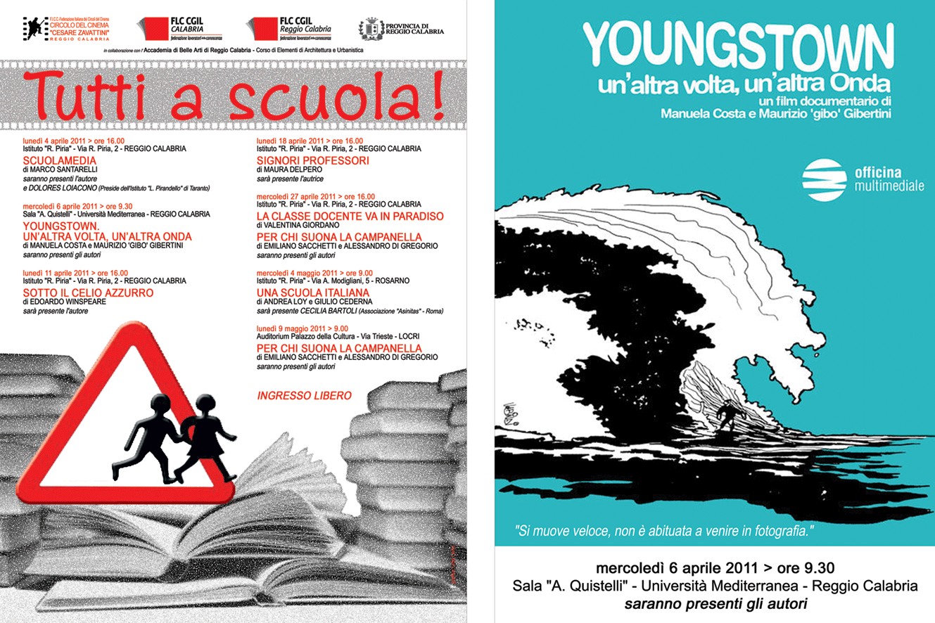 Il Circolo del Cinema “Cesare Zavattini” di Reggio Calabria organizza, in collaborazione con la FLC-CGIL, una rassegna di documentari per offrire a studenti, docenti, precari, operatori e genitori una possibilità di riflessione e di confronto sui problemi della scuola italiana, che si articolerà in sette proiezioni: LUN 28 MARZO La classe docente va in paradiso di V. Giordano LUN 4 APRILE Scuolamedia di M. Santarelli MER 6 APRILE Sala "A. Quistelli" - Università Mediterranea - Reggio Calabria Youngstown. Un’altra volta, un’altra onda. di M. Costa e M. Gibertini LUN 11 APRILE Signori professori di M. Delpero LUN 18 APRILE Sotto il Celio azzurro di E. Winspeare MER 4 MAGGIO - Rosarno Una scuola italiana di A. Loy e G. Cederna LUN 9 MAGGIO - Locri Per chi suona la campanella di E. Sacchetti e A. Di Gregorio Il 6 aprile alle ore 9.30 sarà proiettato presso la Sala "A. Quistelli" il documentario YOUNGSTOWN dei registi Manuela Costa e Maurizio Gibertini, che saranno presenti per introdurne la visione e animare il dibattito.