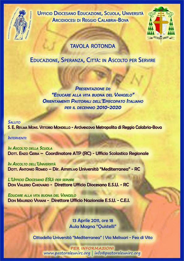 ore 18.00 - Aula Magna "Quistelli" - Cittadella universitaria Presentazione di "Educare alla vita buona del Vangelo", orientamento pastorali dell'episcopato italiano per il decennio 2010-2020. Saluto del vescovo metropolita mons. Vittorio Mondello. Interventi di: -Enzo Geria, coordinatore ATP Uff. Scolastico Regionale -Antonio Romeo, direttore amministrativo Università Mediterranea - Don Valerio Chiovaro, direttore ufficio diocesano E.S.U. -Don Maurizio Viviani, direttore ufficio nazionale E.S.U. Evento organizzato dall'Ufficio ESU (Educazione - Scuola-Università) della Diocesi di Reggio Calabria. Locandina allegata