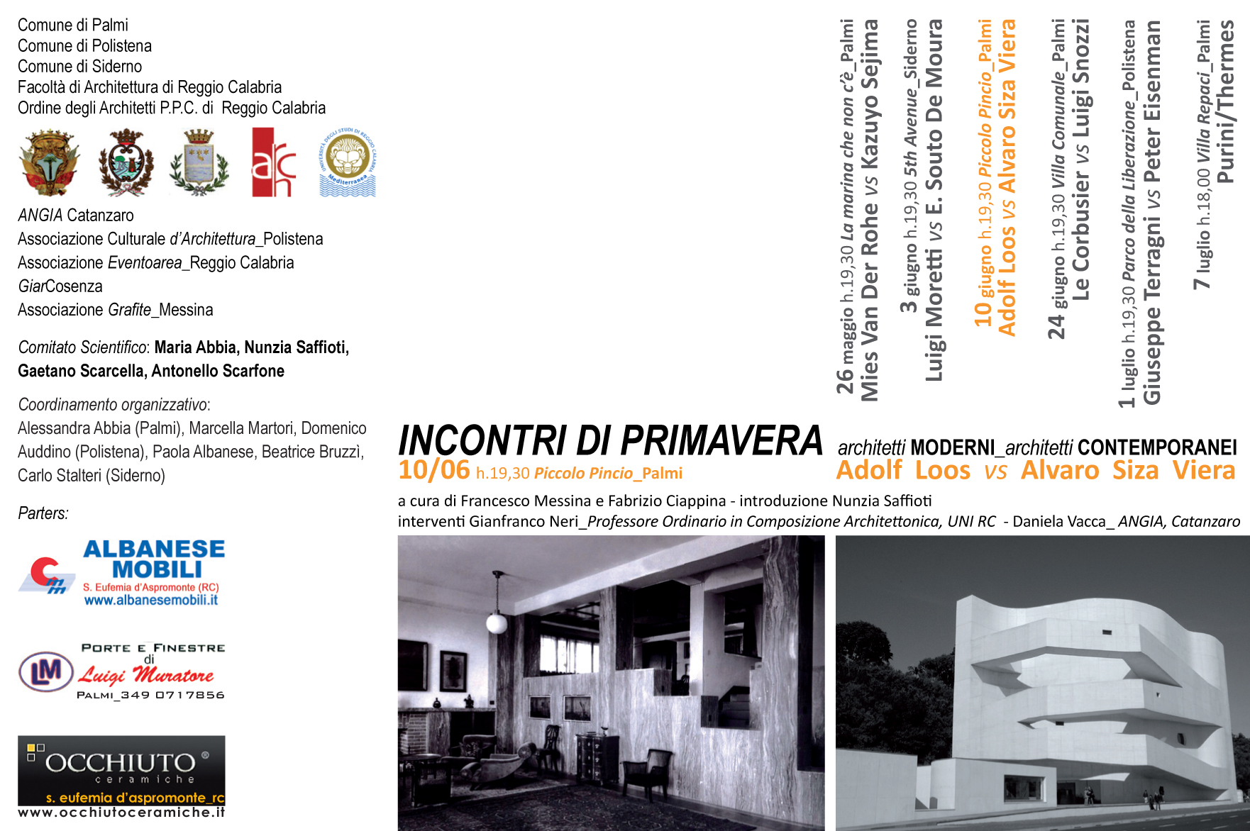 Gli "Incontri di primavera" mettono ogni volta a confronto un maestro della modernità con un architetto contemporaneo. Le comunicazioni, a cura di ricercatori, dottorandi e dottori in progettazione architettonica e urbana, impegnati nella didattica e nella ricerca presso la Facoltà di Architettura della Mediterranea di Reggio Calabria, hanno carattere aperto e si svolgono in prevalenza in sedi non istituzionalizzate per incentivare una partecipazione che non vuole limitarsi ai soli addetti ai lavori. Il terzo incontro il 10 giugno h. 19:30 al Piccolo Pincio di Palmi Locandina allegata