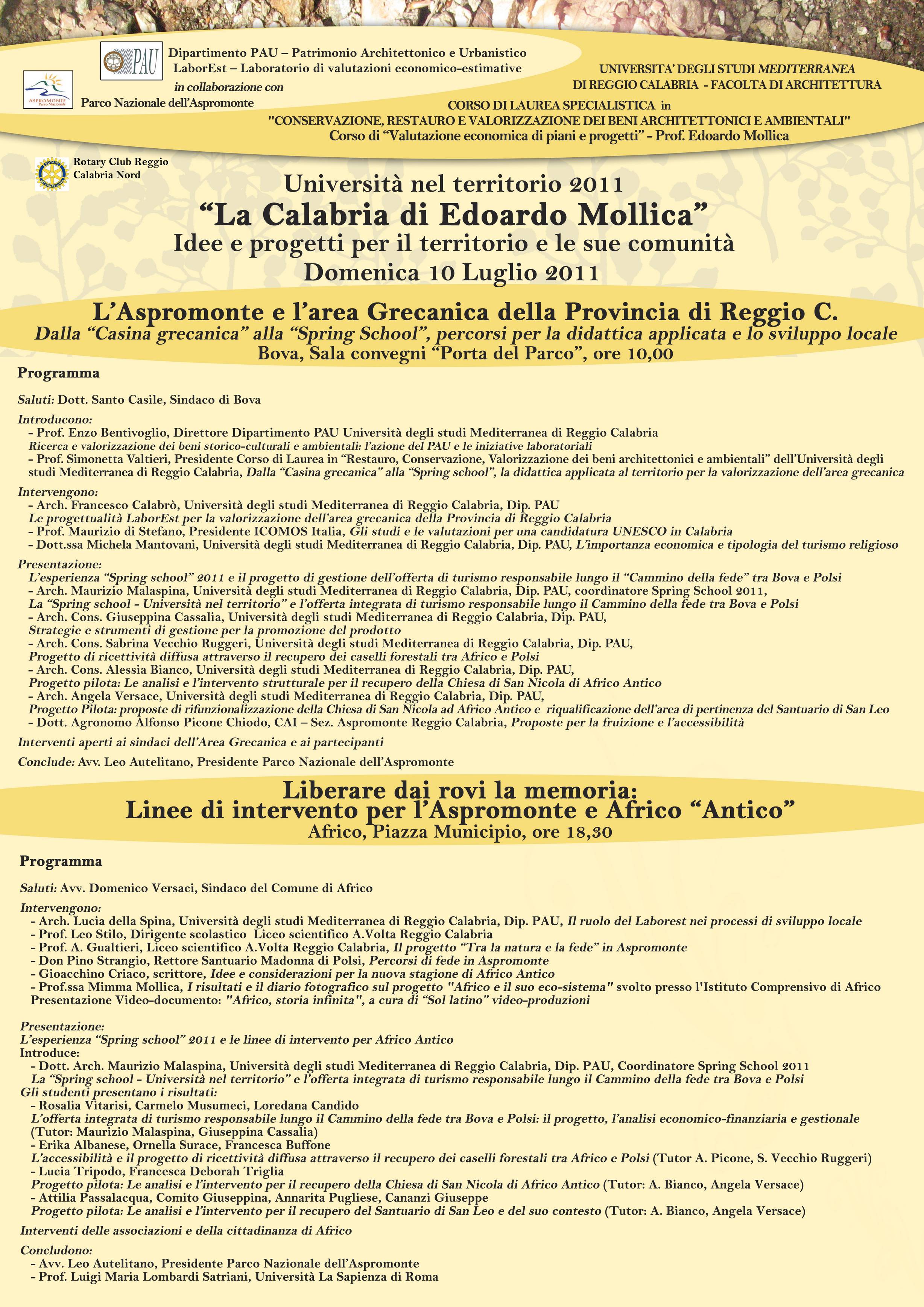 In occasione della presentazione dei risultati della "Spring school 2011 - Università nel territorio", organizzata nell’ambito delle attività del corso di “Valutazione economica di piani e progetti” del prof. Edoardo Mollica, che da cinque anni coinvolge sui temi dello sviluppo locale e della valorizzazione delle risorse territoriali gli studenti del corso di laurea in "Conservazione, restauro e valorizzazione dei beni architettonici e ambientali", è stata organizzata per il 10 luglio, dal Dipartimento PAU, in collaborazione con il Parco Nazionale dell'Aspromonte e il Rotary Club Reggio Calabria Nord, una giornata di approfondimento sulle progettualità messe in campo dal Laboratorio di Valutazioni economico-estimative (Laborest) per l’Aspromonte, in particolare per i territorio dell'Area Grecanica e di Africo “Antico”.