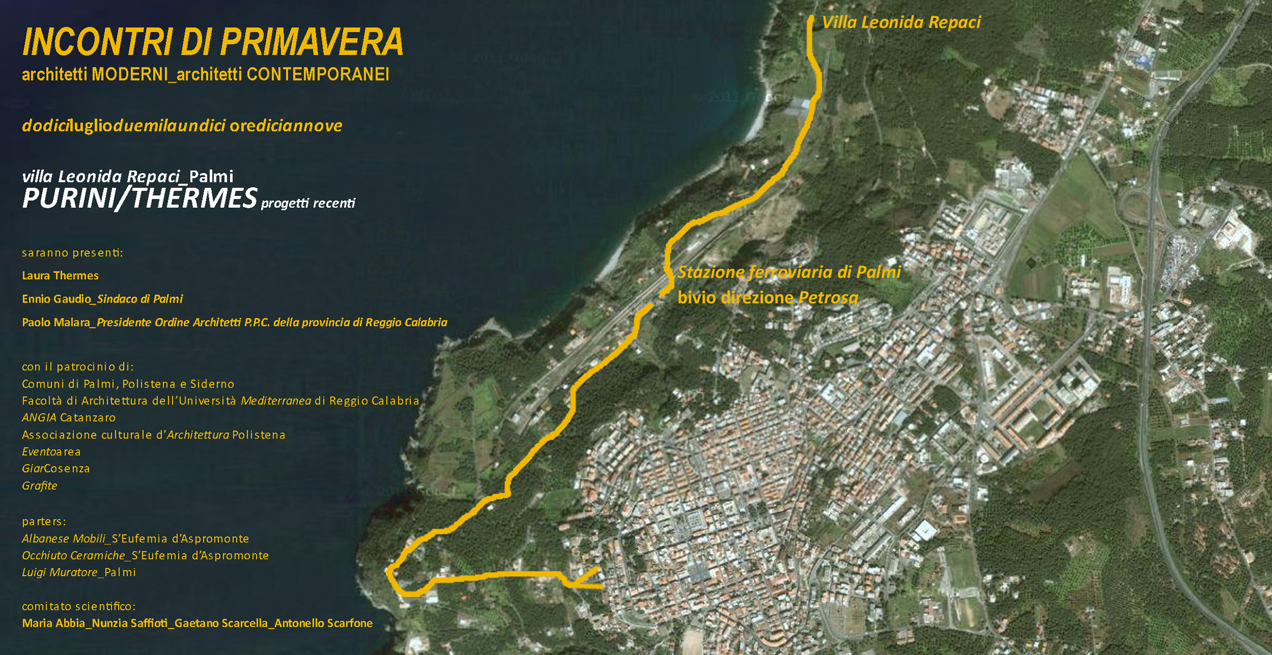 Giornata di chiusura degli Incontri di Primavera nella splendida villa di Leonida Repaci a Palmi. L'appuntamento è per martedì 12 luglio ore 19,00 con Laura Thermes che illustrerà i lavori recenti dello studio PURINI/THERMES. In allegato la mappa/invito.