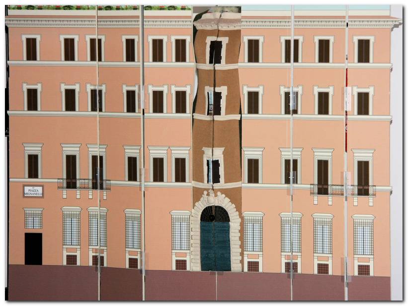 In tessuto Double di Agnona; garantisce, nonostante la difficoltà della lavorazione, una perfetta rifinitura al manufatto. Una particolarità è la “cucitura a sparire”, ogni giuntura è invisibile. La cromaticità del tessuto, nonché la morbidezza stessa mi ha permesso di lavorarlo a nervature per poter rendere al meglio l’effetto a travertino (cornicione, bugnato del portone), tipico dei palazzi romani.