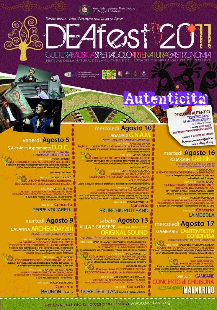 Autenticità” è il progetto DEAfest per l’edizione 2011, al cui centro vi è la riflessione sull’importanza di far riemergere dal territorio “l’autentica autenticità”, spesso diversa da quella percepita, ridotta a semplice rappresentazione di se stessa o meramente folkloristica. E’ su questa identità che la programmazione fa leva per scardinare luoghi comuni e innescare processi di valorizzazione incentrati sulla vocazione dei luoghi, sul paesaggio, sull’ambiente, sulle produzioni locali. Il Festival, nell’edizione 2011 sostiene quella che è la progettualità “forte” per lo sviluppo della Vallata del Gallico, la sperimentazione del primo Ecodistretto della Provincia di Reggio Calabria, progetto promosso dal Dipartimento PAU come modello di governance che punta a mettere insieme operatori, associazioni, amministrazioni e cittadini che vogliono lavorare in sinergia per dare valore ai prodotti di eccellenza della Vallata del Gallico, ai servizi di qualità, alla cultura dell’accoglienza e a quella d’impresa. Il DEAfest diventa così la vetrina di questa progettualità, contribuendo a tracciare un nuovo percorso nel cammino della valorizzazione per i territori e le sue comunità.