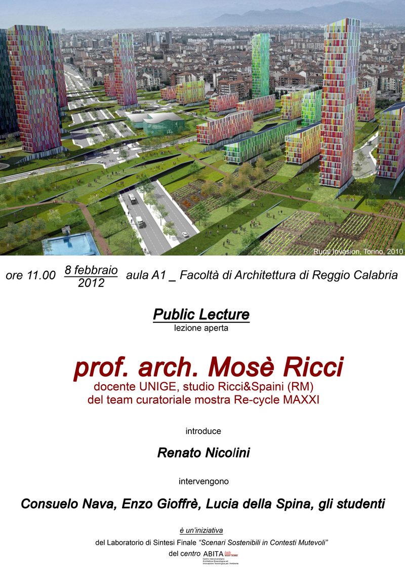 L'8 febbraio Mosè Ricci terrà una public lecture presso la Facoltà di Architettura alle ore 11, per iniziativa del Laboratorio di Sintesi Finale "Scenari Sostenibili in Contesti Mutevoli" e del Centro AbitaLab.